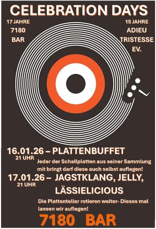 Am Wochenende vom 16./17.01. haben wir in der 7180 Bar einen Geburtstags- Doppelpack. Die 7180 Bar wird 17 und der Verein ADIEU TRISTESSE e.V. 15 Jahre. Wow, was ein Meilenstein der Alternativkultur in Crailsheim!